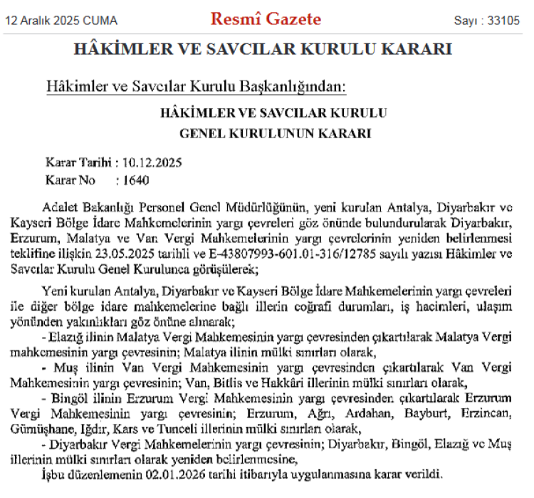 ANKARA (İGFA) – Resmi Gazete’nin bugünkü sayısında yer alan HSK kararı ile yeni kurulan Antalya, Diyarbakır ve Kayseri Bölge İdare Mahkemeleri’nin yargı çevrelerini dikkate alarak bazı İdare ve Vergi Mahkemeleri’nin yargı çevrelerini yeniden belirlendi.